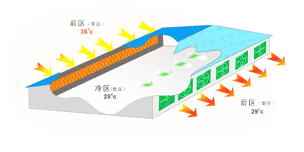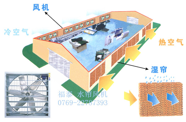2、濕簾風機降溫 利用水的蒸發降溫原理再配以相關設備進行通風而實現降溫目的降溫方法叫濕簾風機。濕簾風機降溫係統利用水的蒸發降溫原理來實現了其降溫的目的。濕簾風機降溫雖然比空調成本低但也需要配備相應設備。需要降溫的時候啟動負壓風機即可,負壓風機會將溫室內的空氣強製性的抽出,造成負壓;同時,水泵將水打在對麵的濕簾牆上。當室外的空氣被負壓吸入室內的時候,就可以以一定的速度從濕簾的縫隙中穿過,空氣穿透濕簾介質的時候,與濕潤介質表麵進行的水氣交換將空氣的顯熱轉化為汽化潛熱,使水分蒸發、降溫,冷空氣流經溫室,吸收室內熱量後,經風扇排出,從而達到降溫目的。