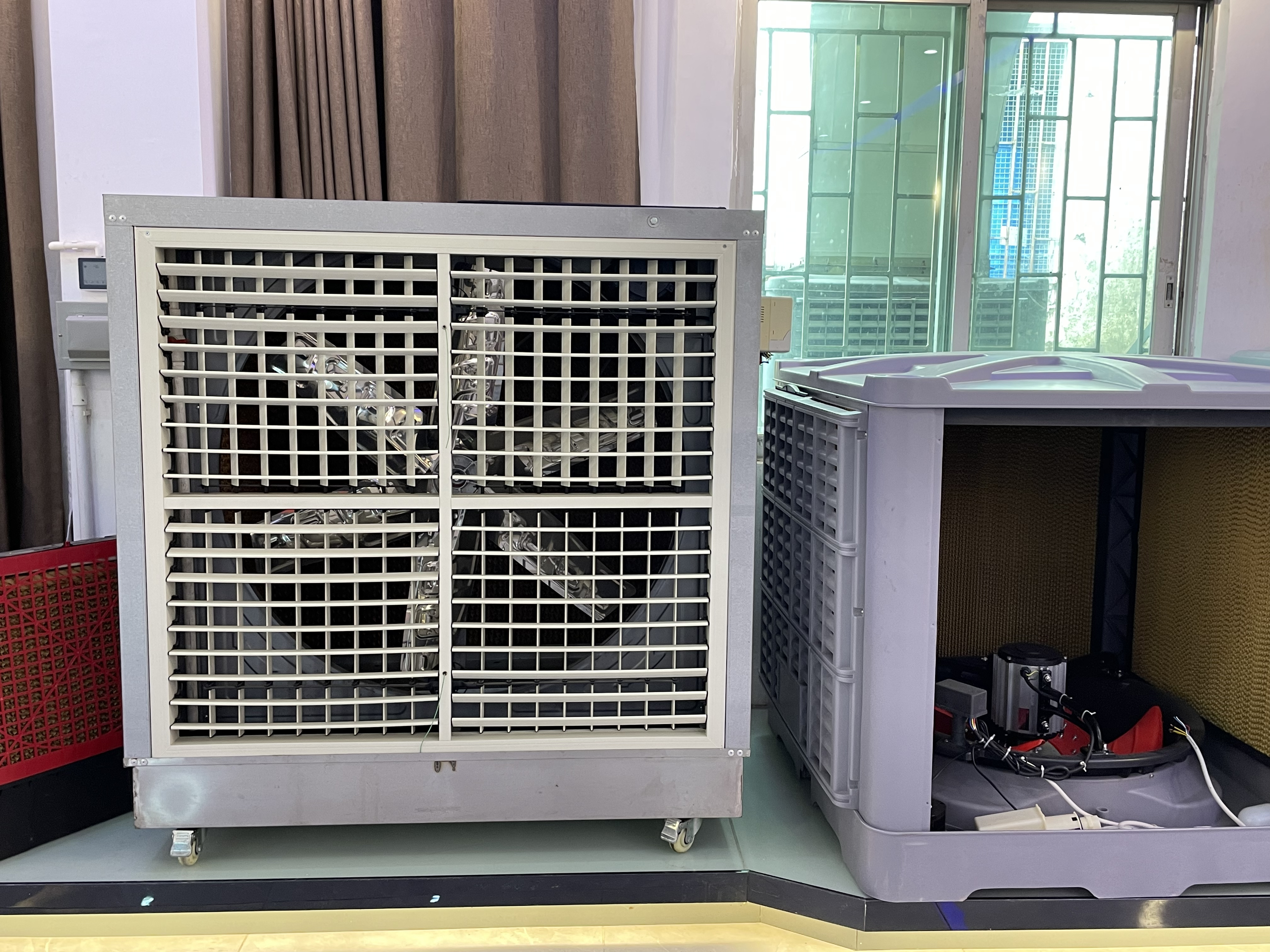 水簾風機,也稱為環保降溫冷風機或濕簾風機,是一種利用水蒸發吸熱原理進行降溫的設備。它主要由麻豆免费在线观看视频(水簾)、風機、水泵、供水係統和控製係統等組成。 工作原理是:水泵將水箱內的水輸送到麻豆免费在线观看视频的上部,水流均勻地流過麻豆免费在线观看视频形成水膜。當室外熱空氣被風機吸入並吹過麻豆免费在线观看视频表麵時,水膜上的水會吸收空氣中的熱量並蒸發,從而使空氣溫度降低。降溫後的冷空氣通過風機送入室內,達到降溫的效果。