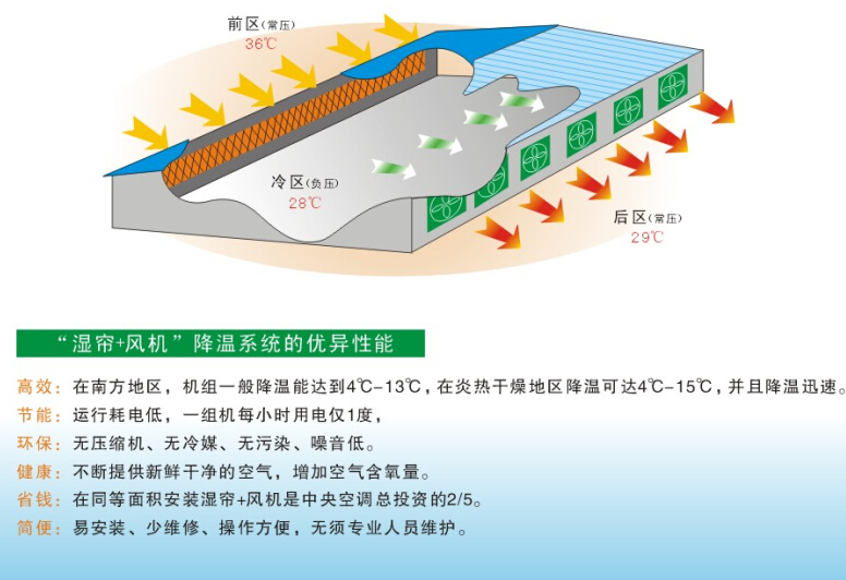 其降溫換氣通風作用,可有效處理工廠95%到99%的高溫、熱空氣渾濁問題。它可以吹氣排氣質量有保證。是降溫通風的選擇。降溫水簾是目前工業行業流行的,它的降溫環保作用和省電作用是其他降溫設備所沒有的。